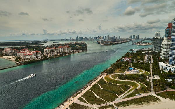 A view of South Pointe, Miami Beach, and Fisher Island, with the downtown Miami skyline on the horizon.CreditOscar Hidalgo for The New York Times