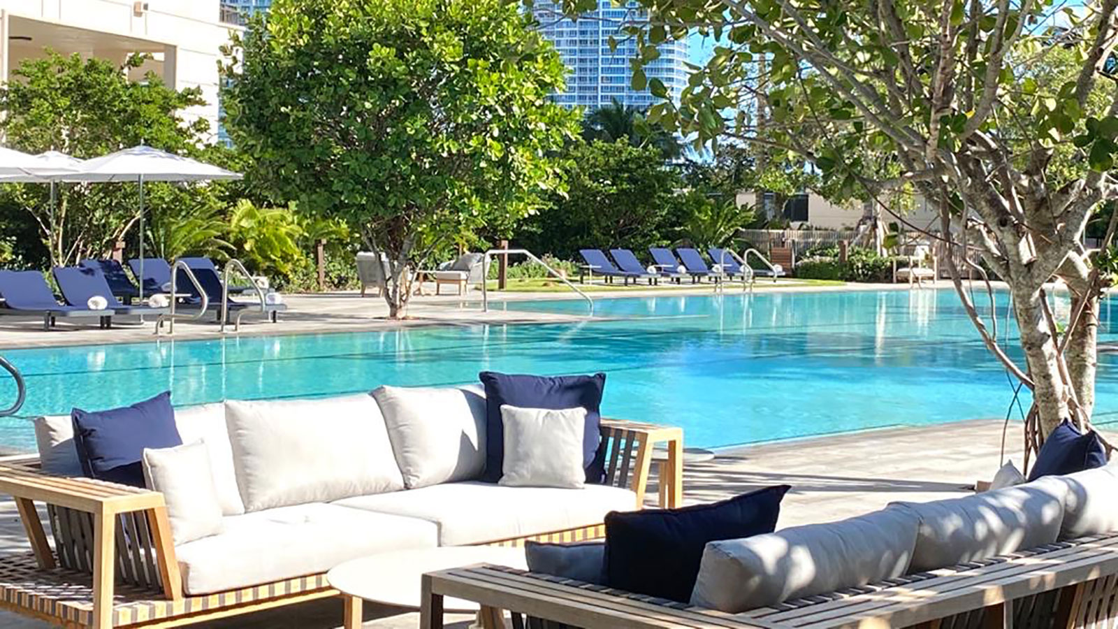 • Enzo Enea-designed private pool decks finished with Ipe wood and Sea Grey granite hardscaping and verdant landscaping