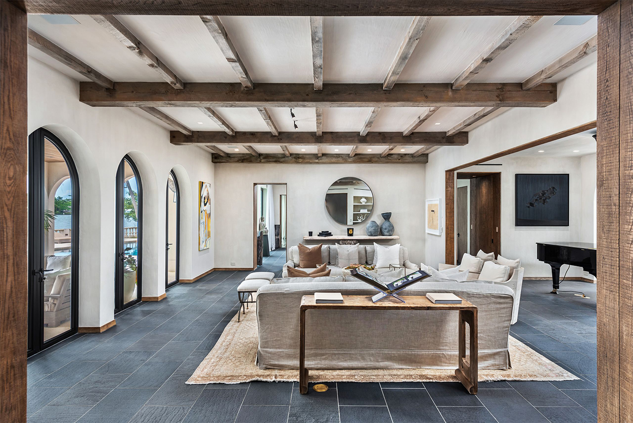 In one of the living spaces, there are wood beamed ceilings and tile floors.