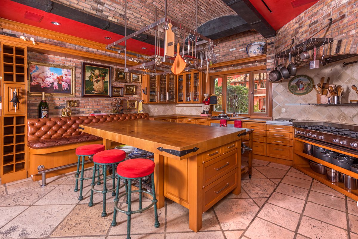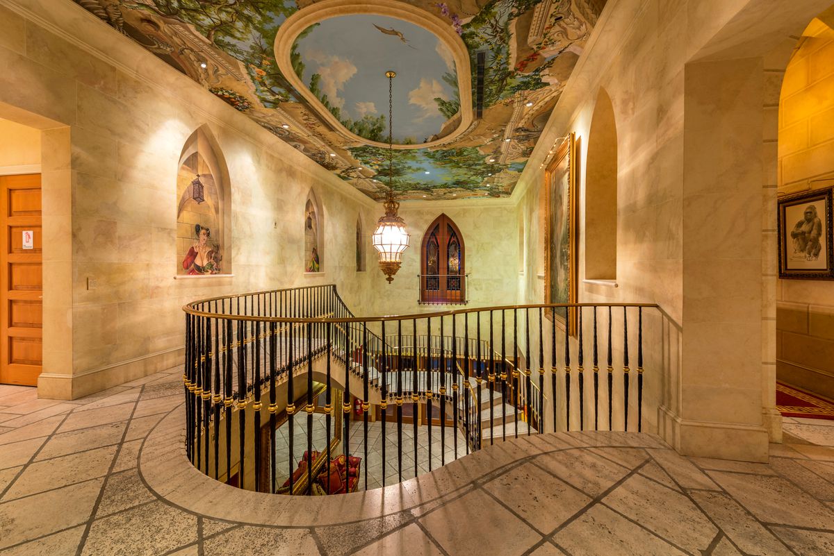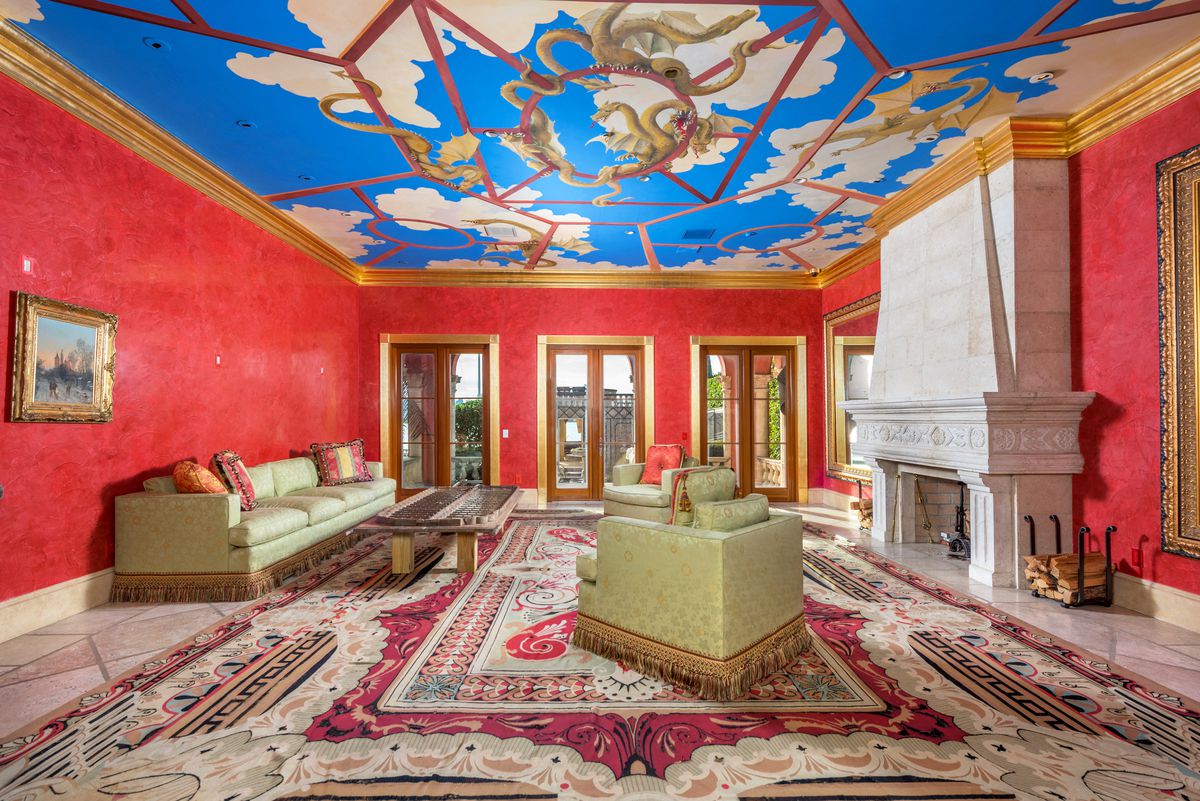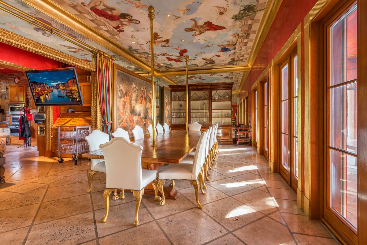 There’s also very quirky decor, in the form of a dining table adorned with what look like stripper poles and more ceiling murals than the Sistine Chapel. Take it all in these photos, and notice how some of the items from the auction pop up, like that rhino statue.