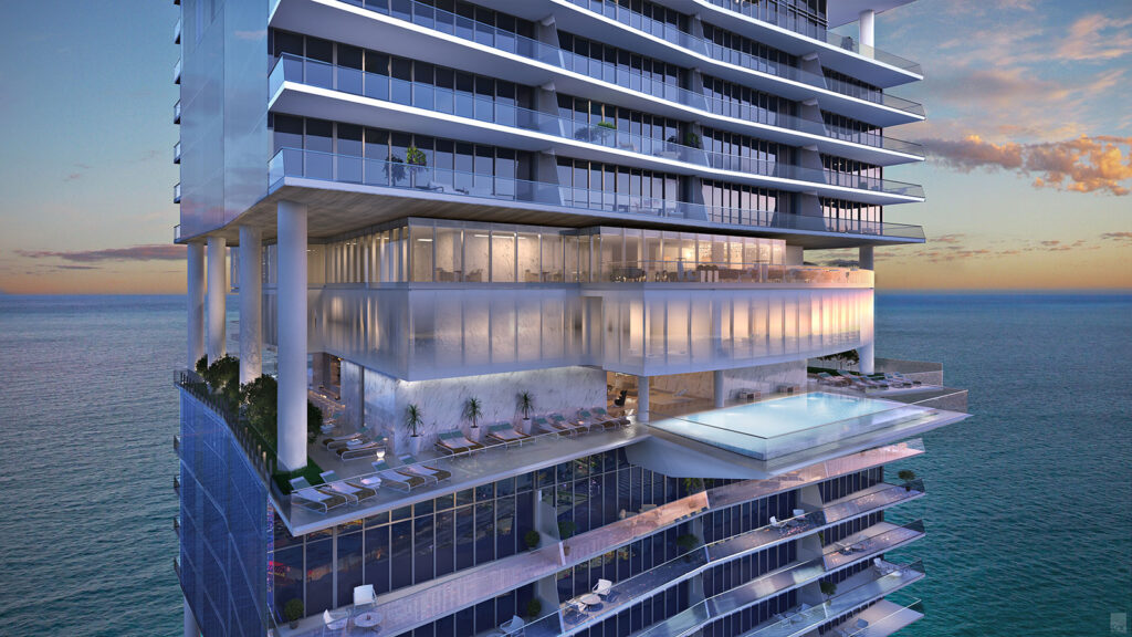 - A three-level indoor/outdoor private club is set approximately 300′ above sea level (on the 30th thru 33rd floors) and includes:
