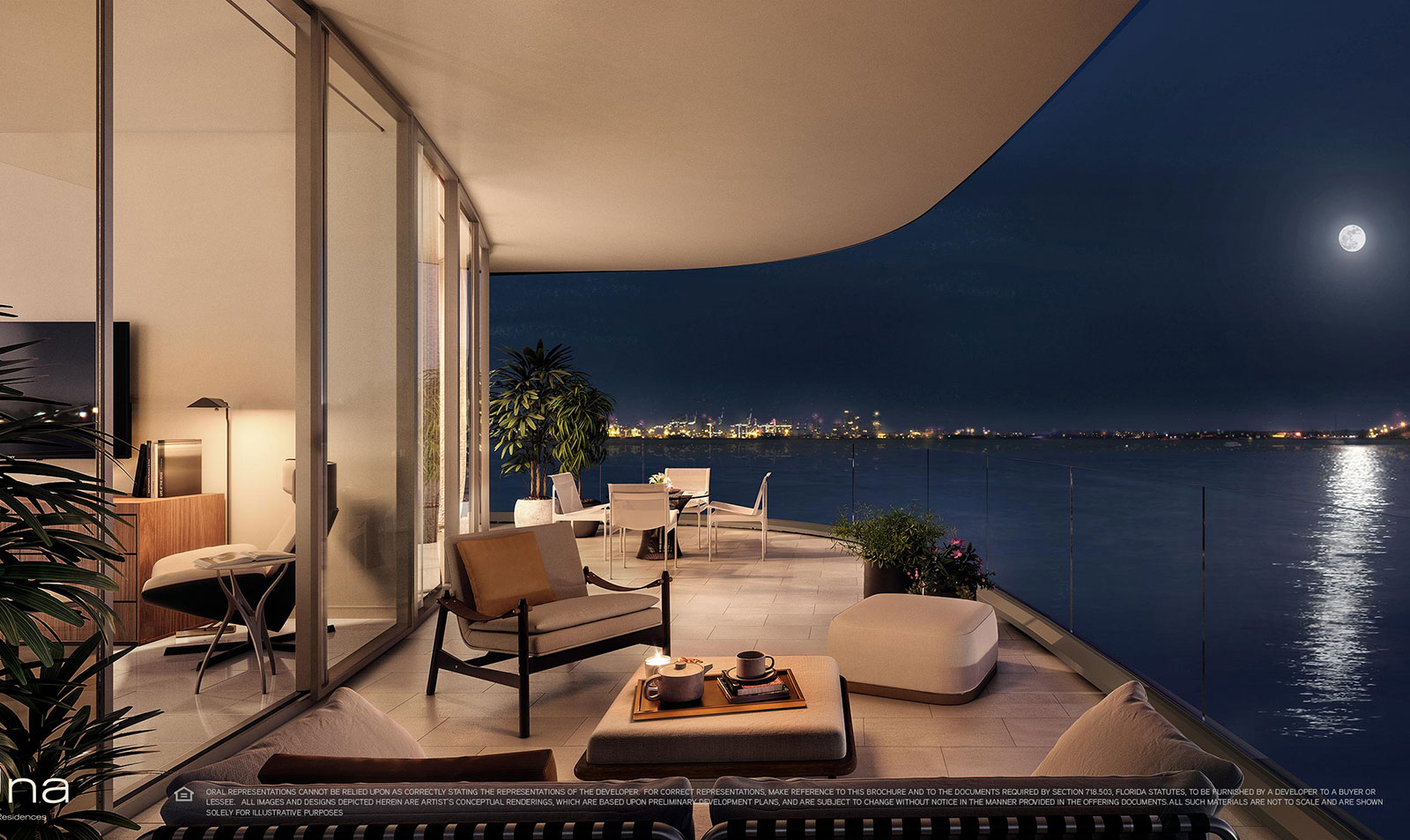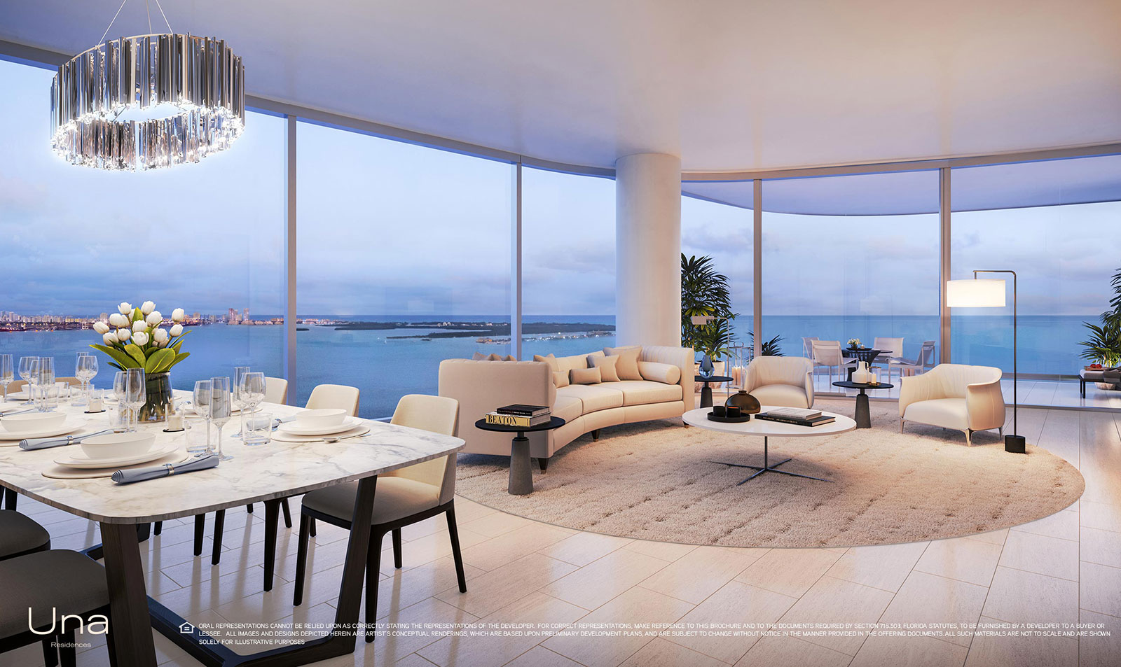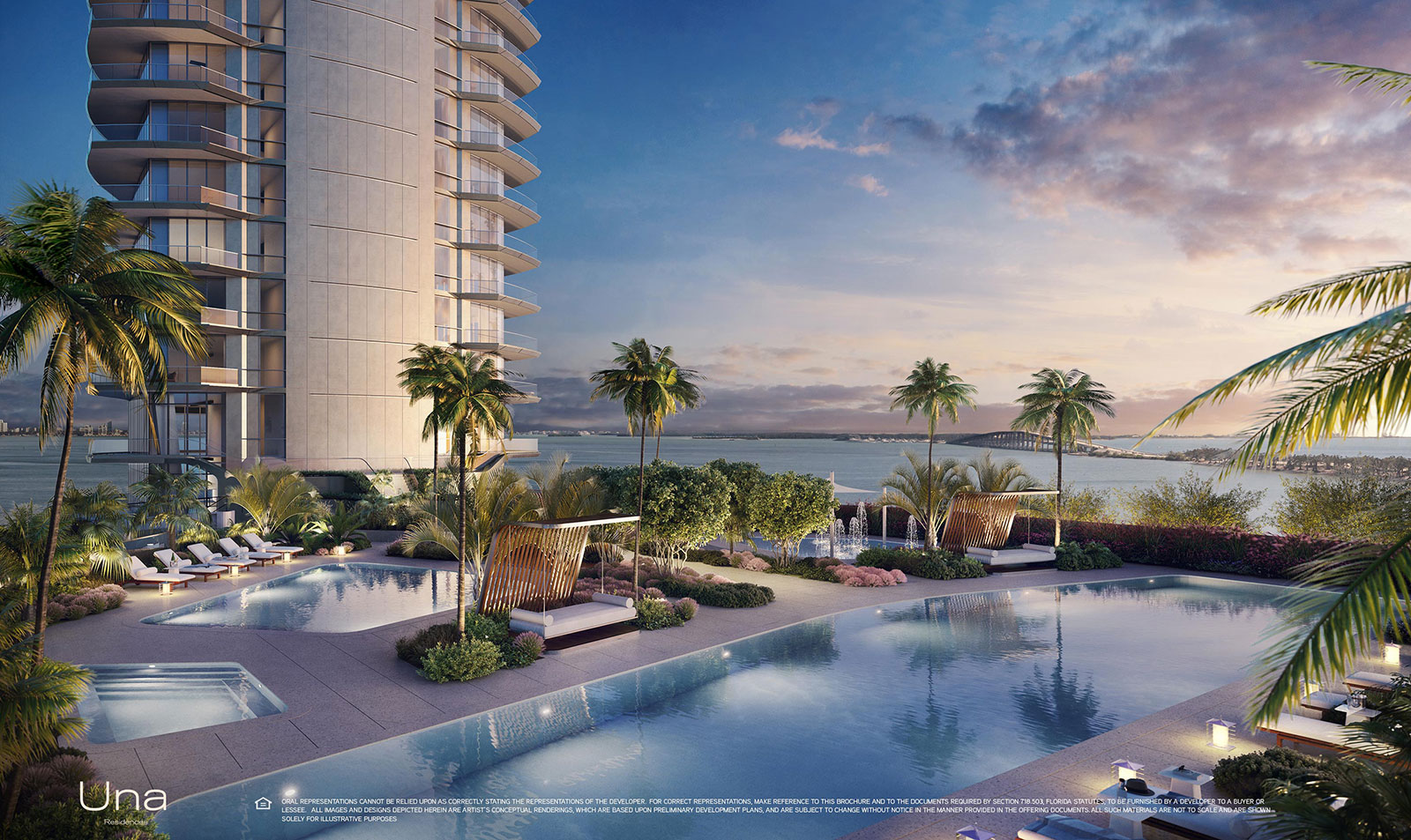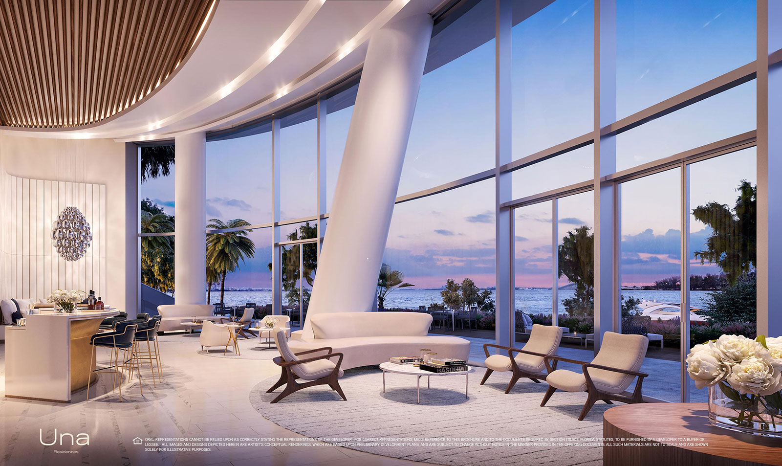 Designed by Adrian Smith + Gordon Gill Architecture, Una takes its inspiration from the elegant shapes and materials of classic yacht design. Instantly recognizable by the sweeping curve of its dramatic silhouette, the building’s glass surface brilliantly reflects the dazzling sunlight, while the floor-to-ceiling windows take advantage of a coveted setting on Biscayne Bay. With lush gardens designed by Enzo Enea, extensive amenities such as the spa and gym, elegantly envisioned by the chairman of Aman, private boat slips, and easy access to Coconut Grove, Downtown, Brickell, Miami International Airport and the beaches of Key Biscayne, Una is an exemplar for Miami living.